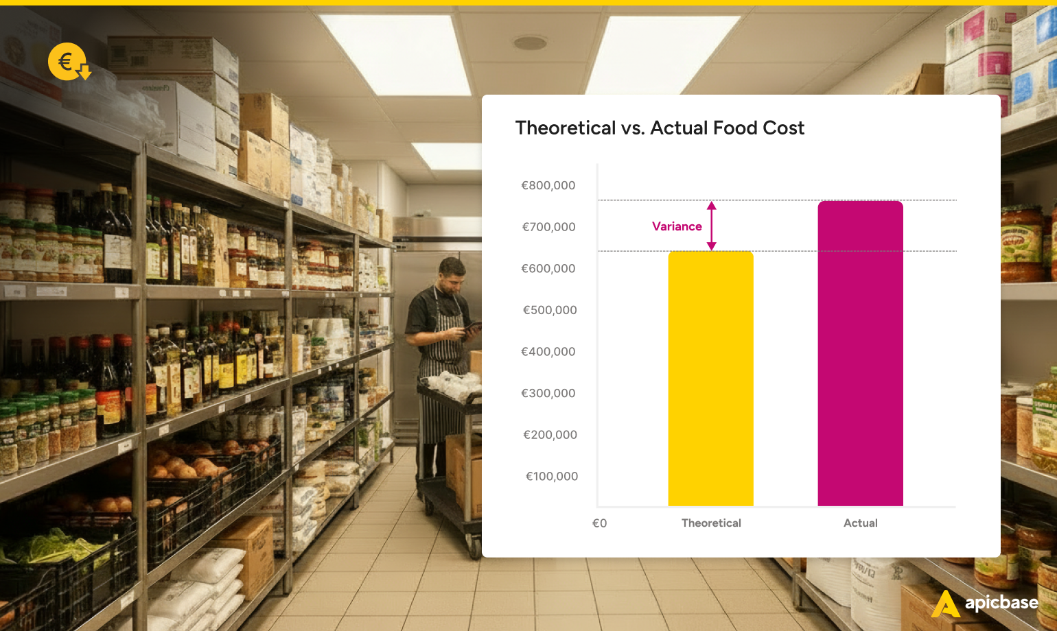 Example: A site does €60,000 in revenue for the month. Theoretical food cost is €18,000. Actual food cost comes in at €21,000.