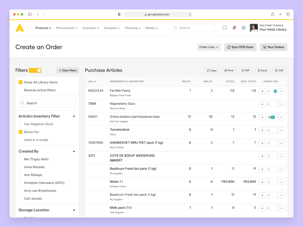 - Digitale inventaris – software voor restaurantbeheer, zoals Apicbase, houdt het voorraadniveau automatisch bij. Verkoop, productie en interne overdrachten putten de voorraad uit op basis van de specificatiebladen van de recepten. Zodra de artikelen onder het nominale niveau komen, maakt het systeem een bestelbon aan die je kunt bekijken en goedkeuren.