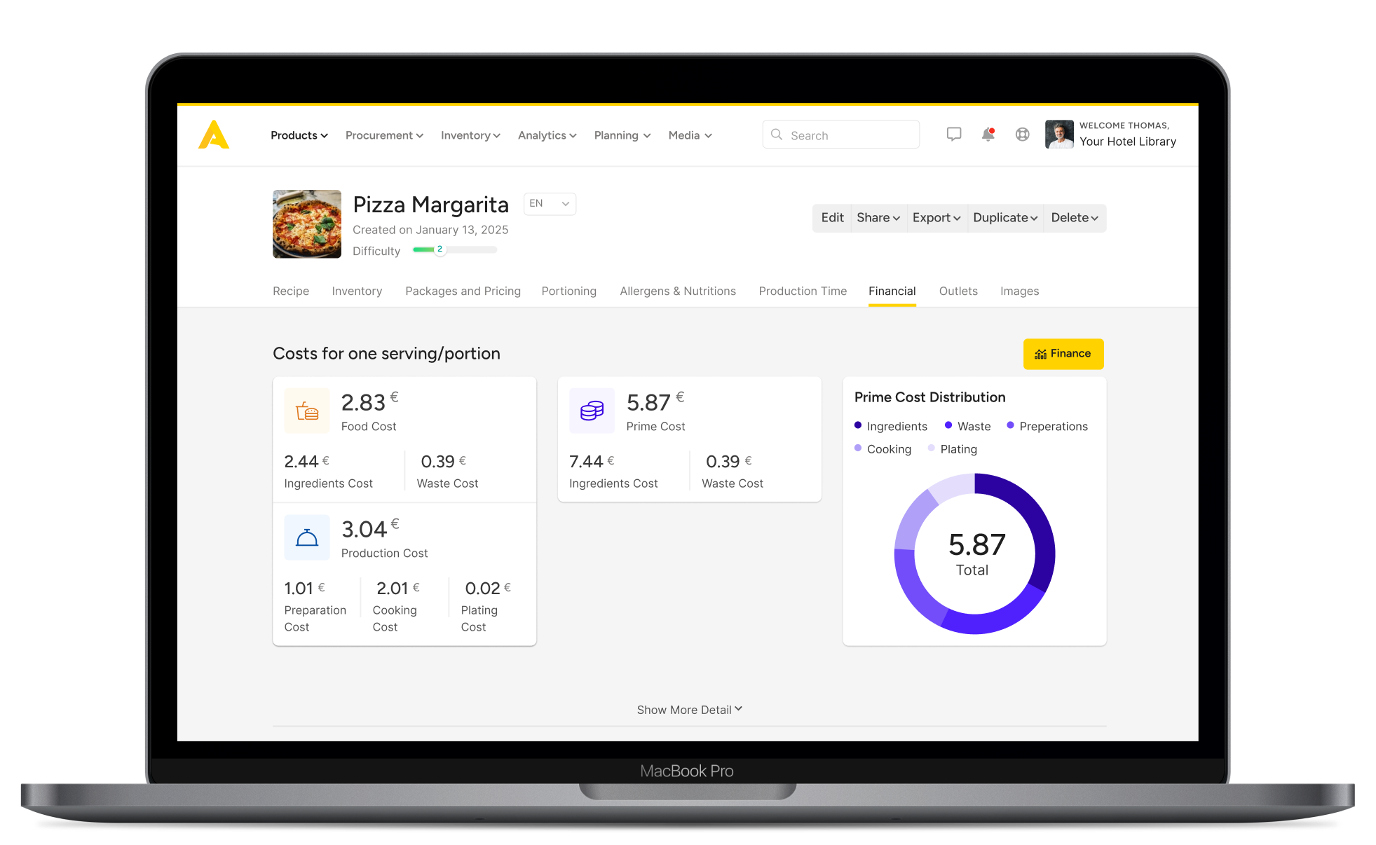 Build fully costed and portioned recipes, including sub-recipes, with step-by-step instructions and dietary information. Tweak them to perfection and store everything securely in the cloud.