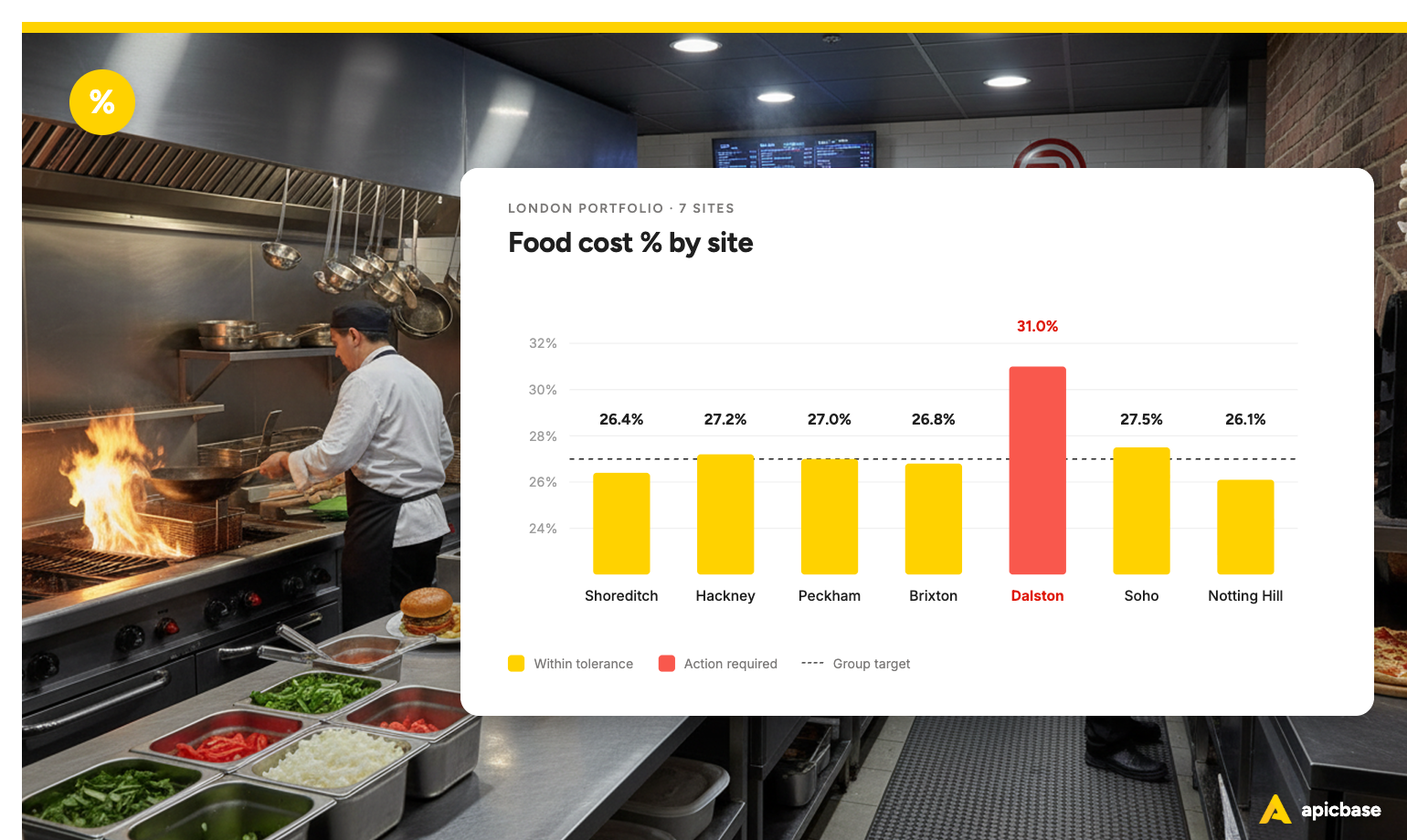 Apicbase’s variance dashboards break this down by site, by ingredient, and by period, so you’re not comparing top-line food cost across locations, but drilling into which specific item at which specific site is driving the gap.